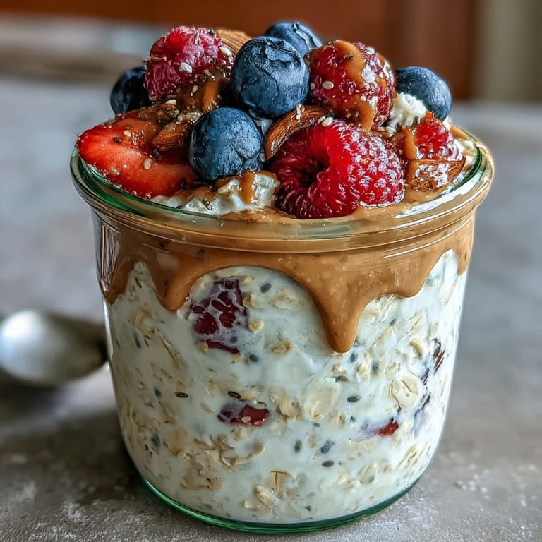 These overnight oats celebrate the simple pleasure of whole foods coming together in perfect harmony. The natural creaminess of oats combined with the protein-rich almond butter creates a satisfying base, while the fresh berries add bursts of antioxidant-rich sweetness. It's meal prep magic that transforms basic ingredients into a breakfast worth getting out of bed for.