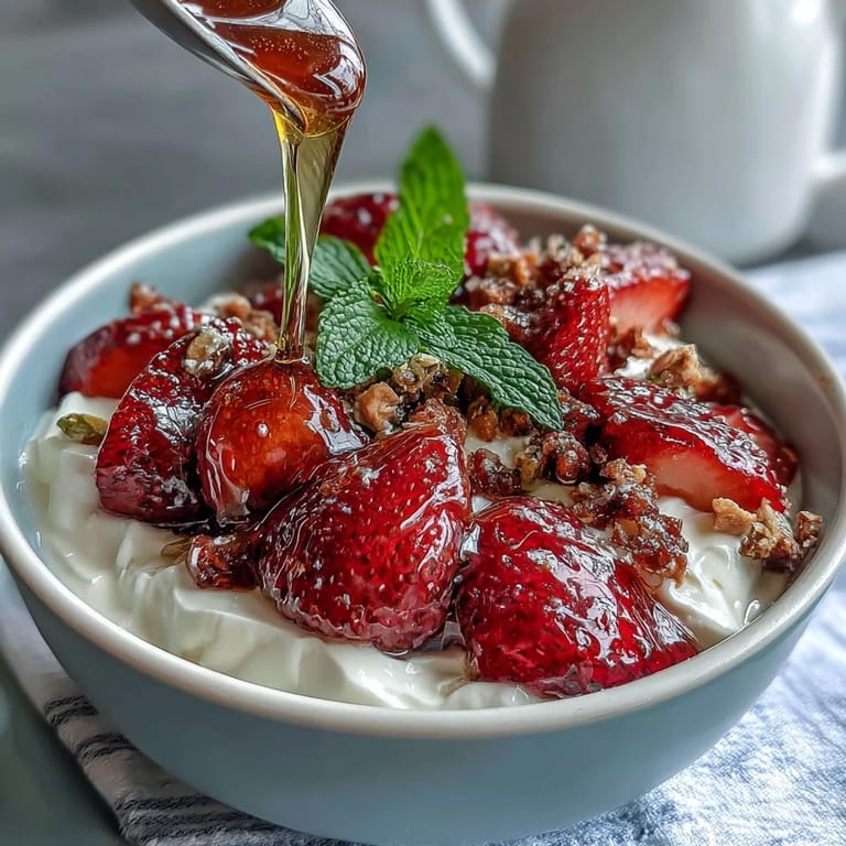 This recipe highlights the natural sweetness of fresh strawberries gently cooked into a compote, which pairs beautifully with the tangy creaminess of Greek yogurt. The choice of nuts adds delightful crunch and depth while the honey enhances the overall harmony of flavors. Fresh mint leaves provide a refreshing finish that awakens the senses.
