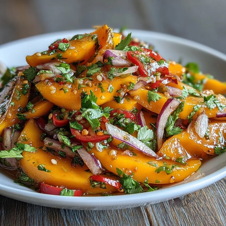 Pin It One sticky afternoon in July, I found myself staring at three overripe mangoes on the counter, their perfume filling the kitchen. I wasn't in the mood for anything heavy, and the idea of turning on the oven felt impossible. That's when I remembered a salad I'd tasted at a tiny street cart in Portland—sweet mango ribbons tangled with crisp vegetables and a lime dressing so bright it made me blink. I pulled out my sharpest knife and got to work, and twenty minutes later I was eating straight from the bowl, standing barefoot on the tile.