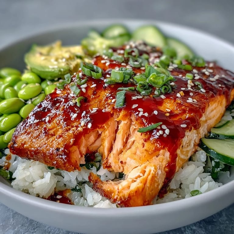 The secret to this dish lies in the glossy glaze that caramelizes slightly in the pan, coating the tender salmon. Topped with a zesty sriracha mayo, every bite offers a delightful contrast of temperatures and textures, from the warm rice to the cool, crunchy vegetables.