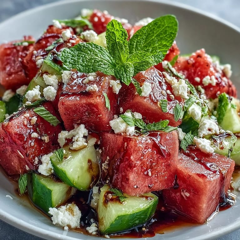Prep your ingredients in advance and keep them separate in containers—watermelon cubed, cucumber diced, mint ready—then assemble right before serving. If you're transporting it to a gathering, pack the balsamic glaze separately and add it on-site so nothing gets soggy during the drive.
